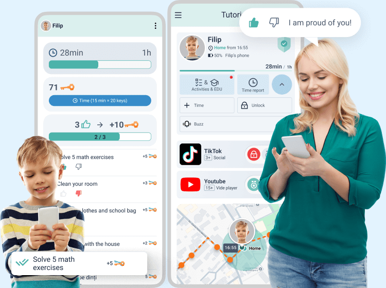 Controlezi accesul online și alegi cât stă copilul pe telefon. Când este online, îl știi în siguranță. Tutorina filtrează conținutul web prin mai multe metode, blochează aplicațiile care pot da dependență și te anunță dacă cel mic este expus la bullying online sau i se cer date personale.