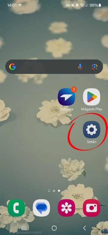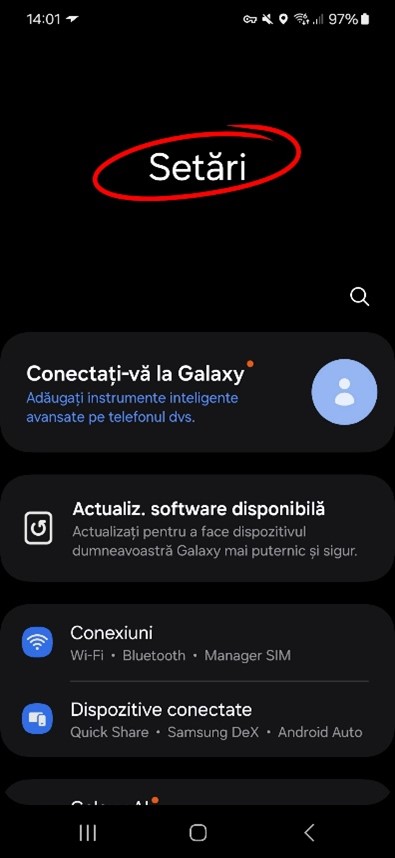 Poți accesa Setările și glisând în jos din partea de sus a ecranului pentru a deschide bara de notificări, apoi apăsând pe icoana ⚙️ din colțul din dreapta sus.